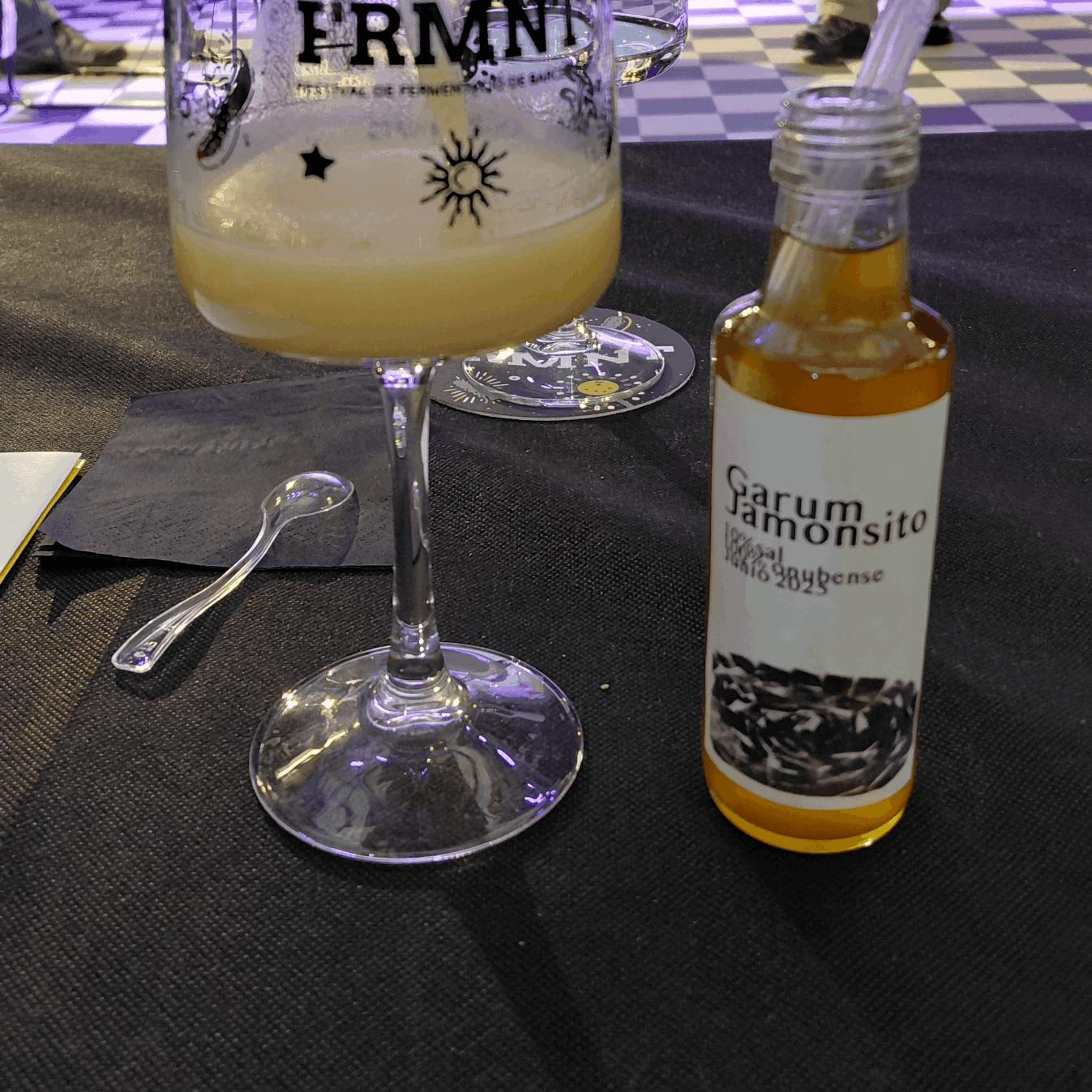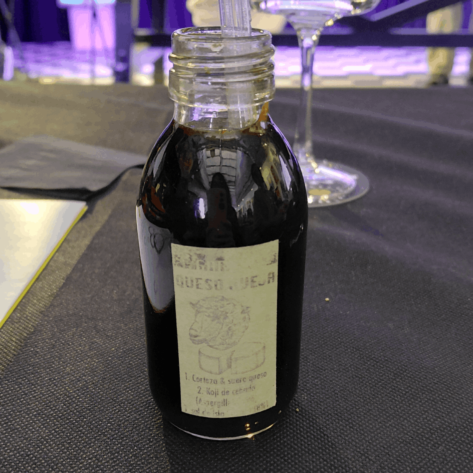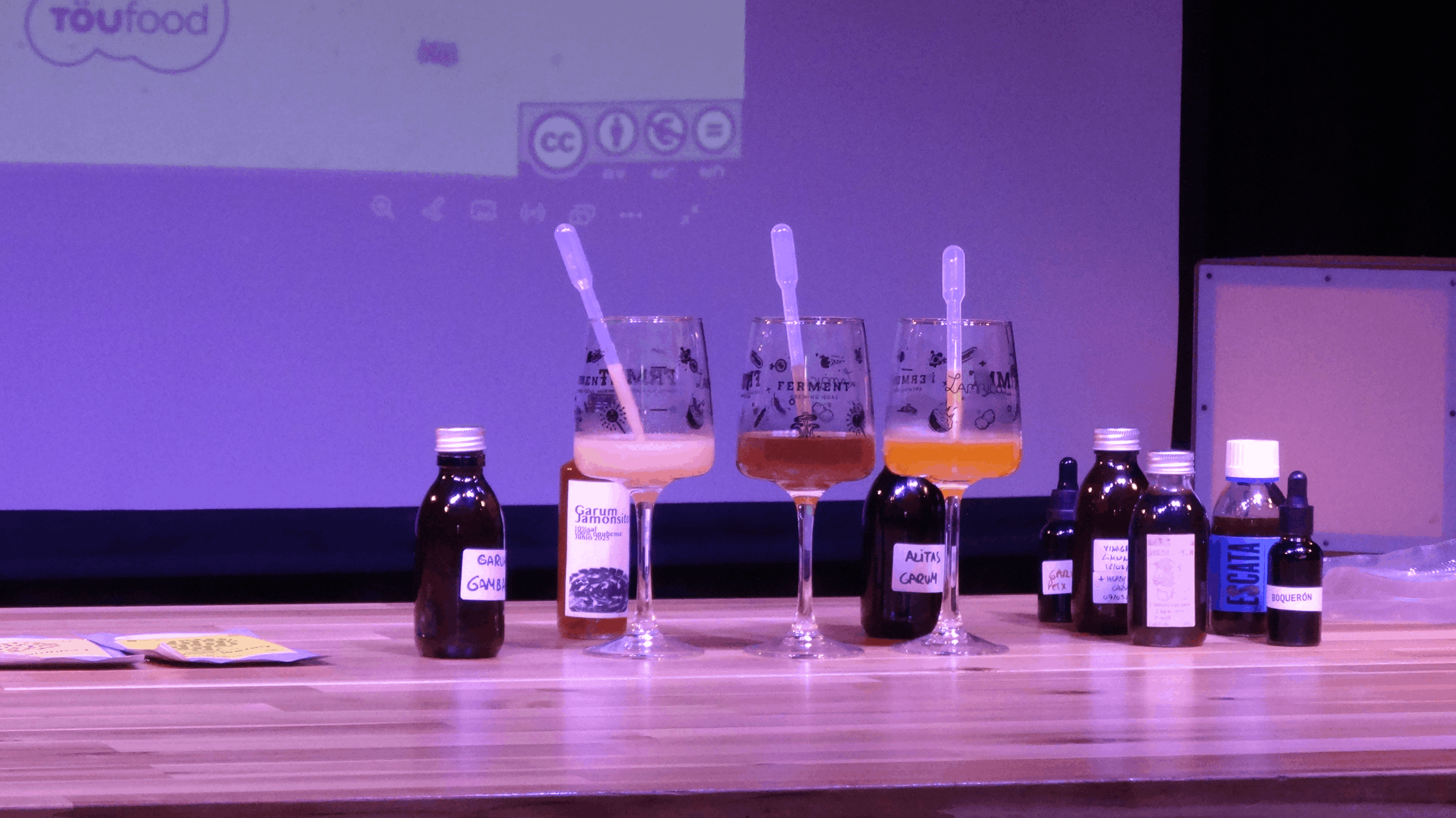 Probamos el garum de jamón serrano -con enzimas y con koji-, el de cortezas de queso -koji-, el de pescado de roca -tradicional + koji, hecho durante la charla del año pasado-, el de boquerón -totalmente tradicional-, el de gamba -enzimas-, el de puchero de lentejas -enzimas- y el de alitas de pollo -enzimas y koji-.