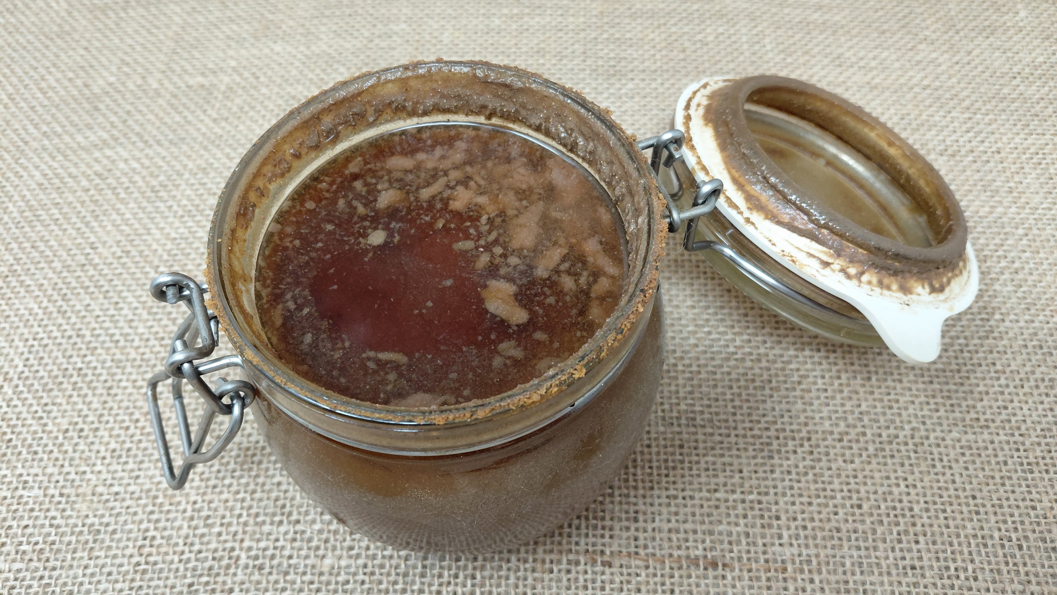 Un mes después, nuestro garum "manipulado" sigue siendo bueno, pero notamos que ha desarrollado un retrogusto en boca algo amargo. ¿Serán las hierbas añadidas a posteriori las culpables?