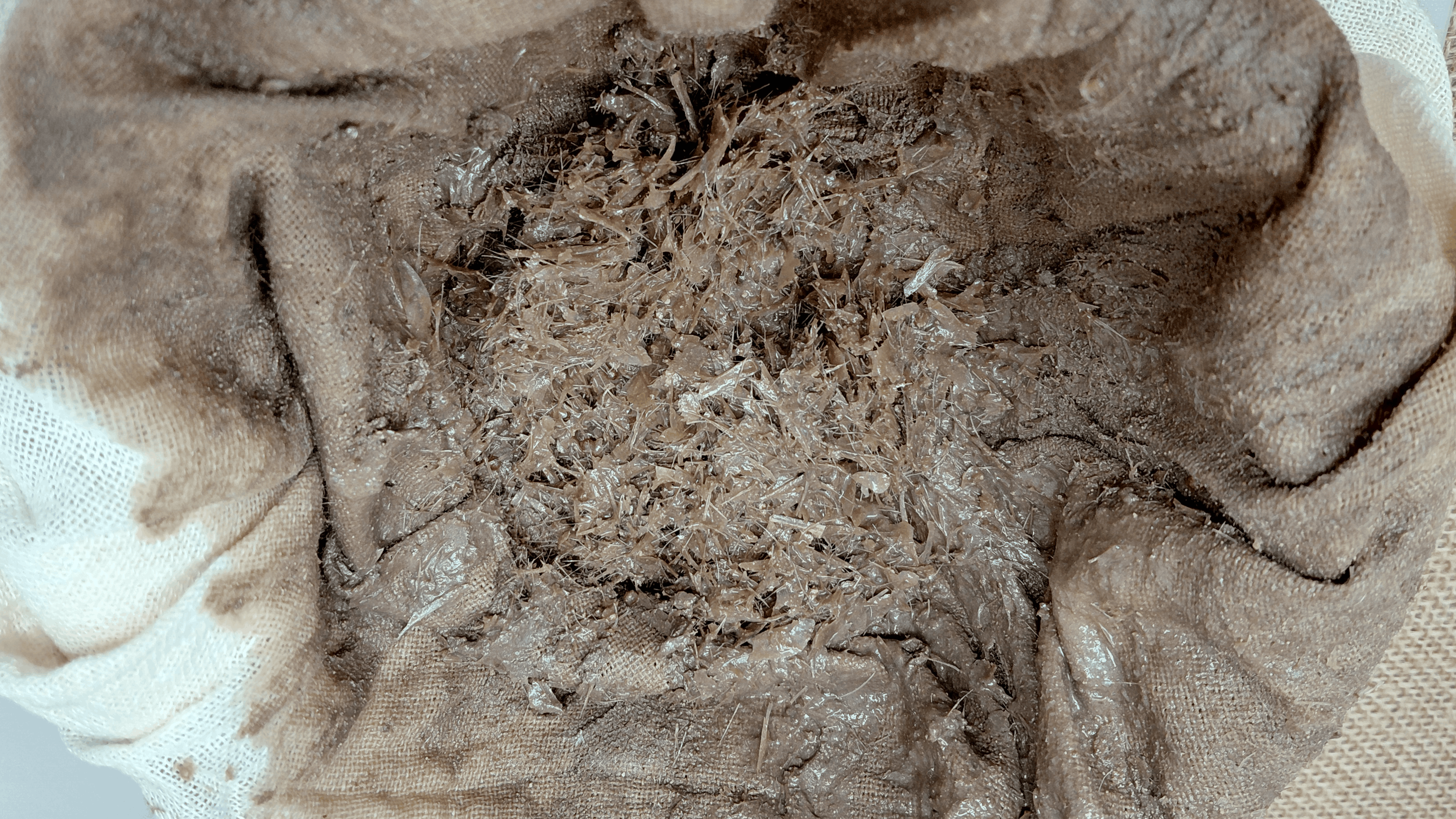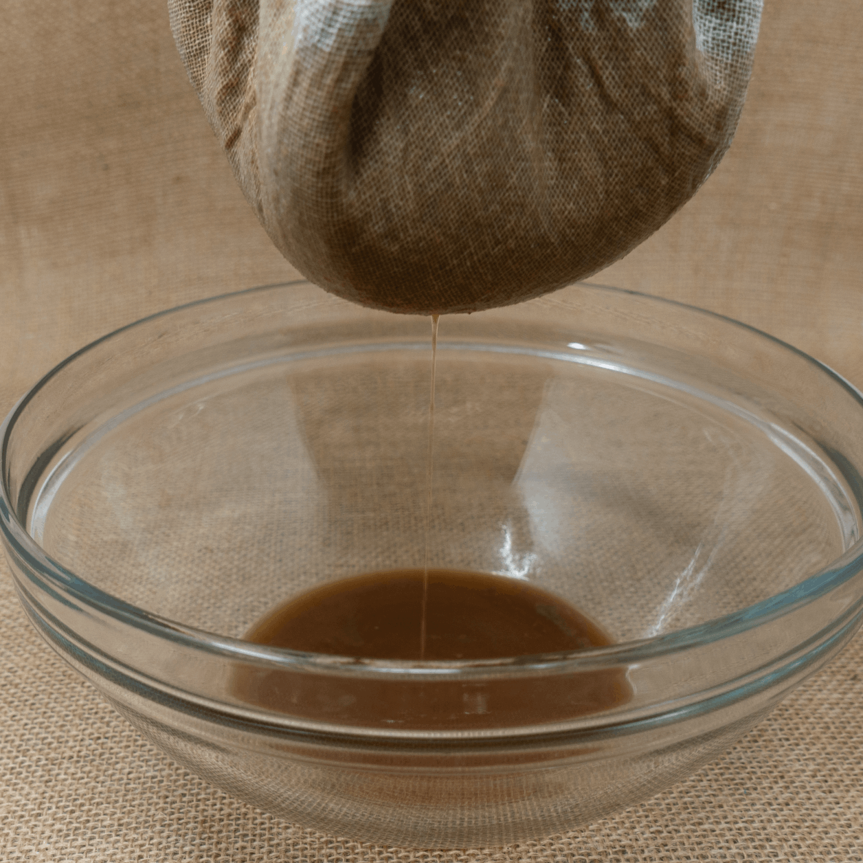 Procedemos a filtrar con una estameña para separar el residuo sólido. Hay muy poco residuo, sobre todo en comparación con el garum anterior, prácticamente solo quedan restos de espinas. Procedemos a dos filtrados más con papel de celulosa de doble capa, hasta obtener un líquido limpio.