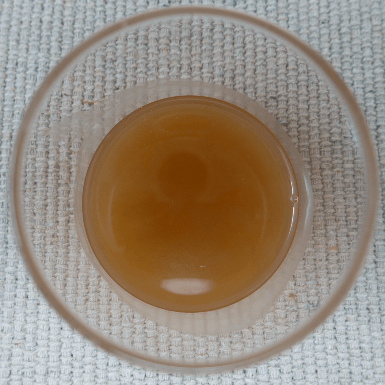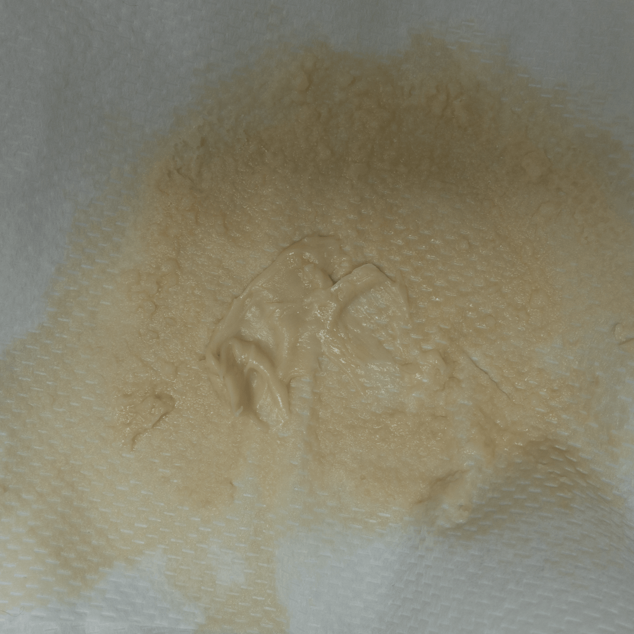 Dejamos reposar el líquido obtenido unas horas y vemos que se forma una capa superior de grasa que va solidificando. Procedemos a un segundo filtrado con papel de celulosa de doble capa. Guardamos el resultado en la nevera y al día siguiente lo sometemos a dos filtrados más, puesto que aún aparece otra capa de grasa. Tras cuatro filtrados, la capa de grasa ha desaparecido pero no completamente dejando un garum turbio.