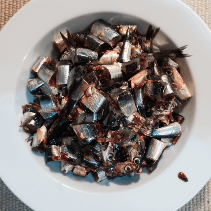 Cortamos el pescado en trozos. Hemos utilizado boquerón, pero cualquier pescado graso serviría. Muy importante: frenar el impulso de los pescaderos de eviscerar el pescado.