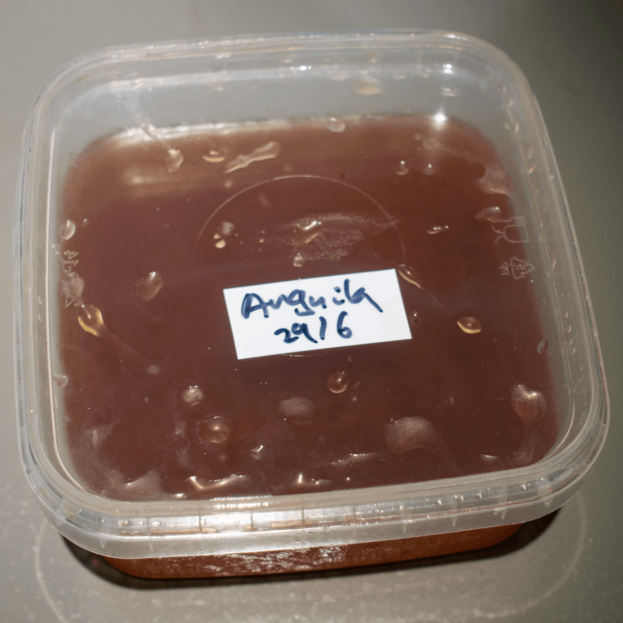 En solo tres días se había disparado y se avinagró: un garum desviadísimo, muy ácido, que con suerte se puede utilizar como aliño. Según Oliver, el secreto está en controlar mucho la estabilidad de la temperatura -hay que evitar las olas de calor por encima de 32 grados- y en la cantidad de proteasa que hay que poner, que debe ser muy poca. Confía en las posibilidades de la proteasa aplicadas al producto en crudo, solo se trata de seguir haciendo pruebas...